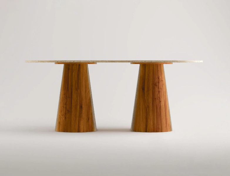 Die Tischplatte aus massivem Travertin begeistert durch ihre einzigartigen Maserungen und warmen Farbnuancen. Getragen wird sie von konischen Holzbeinen, die dem Tisch Leichtigkeit und eine moderne Ausstrahlung verleihen.